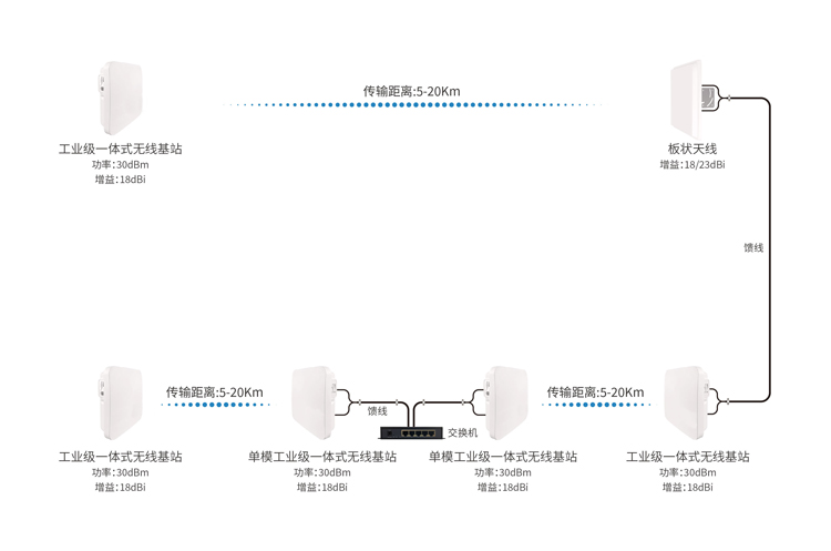 工业级无线基站是一款支持802.11a/n/ac标准的大功率、高带宽、高性能的5.8GHz工业级天线一体化无线基站,该设备射频部分基于MIMO(多进多出)技术,采用2T2R的构架,无线频宽支持20/40/80MHz,物理层带宽可达到866Mbps。采用1000M网口设计,实际吞吐量最大可达350Mbps以上。该设备最大发射功率1000mW,具有-96dBm@6.5Mbps的接收灵敏度,内置25dBi高增益双极化定向天线,综合环境下点对点桥接距离可达15~20km,点对多点配合多倍通客户端(全向天线)可提供3km以内的无线接入能力,可满足中等距离高带宽无线组网需求和近距离无线覆盖应用需求。